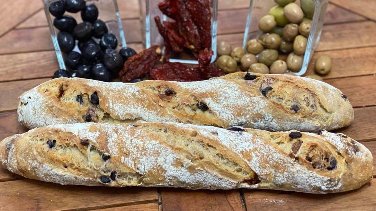 Baguette mit Oliven & getrocknete Tomaten ohne Kneten/Übernachtbaguette
