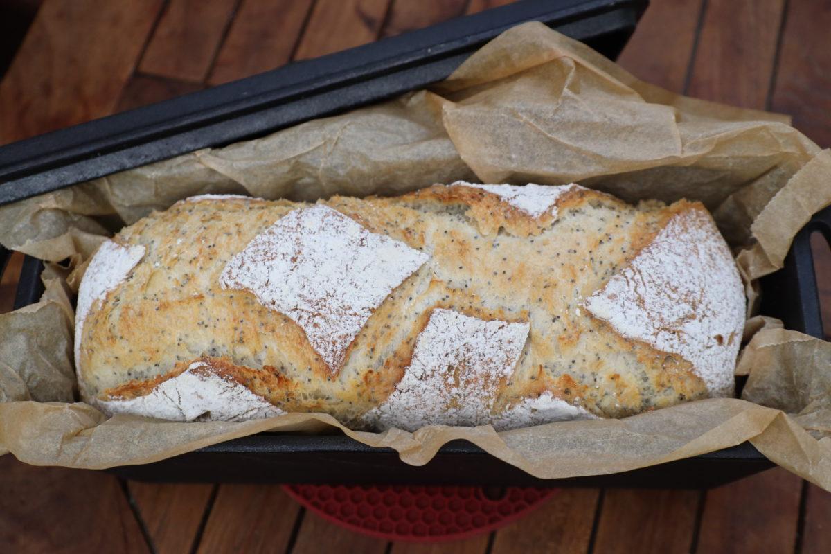 den heißen Kasten von Ofen rausholen, dann Brot mit Backpapier in den Form legen, und für 20 min ( auf 220 grad Ober/Unterhitze) mit Deckel dann für weitere 20 min ohne Deckel backen. Guten Appetit.
