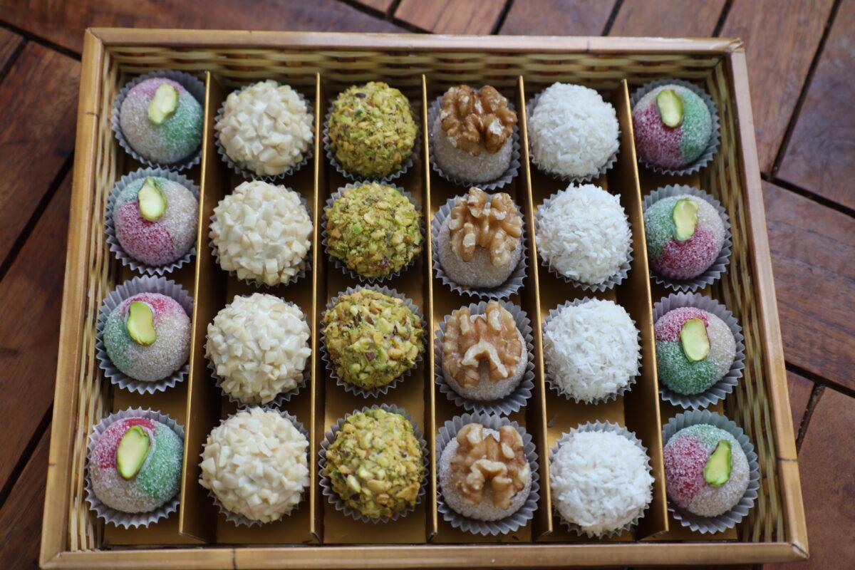 - Eine Kleine Häufchen von der Mischung nehmen und in der Mittel eine Pistazien drücken, verschließen und mit den Hände zu Kugel formen.
